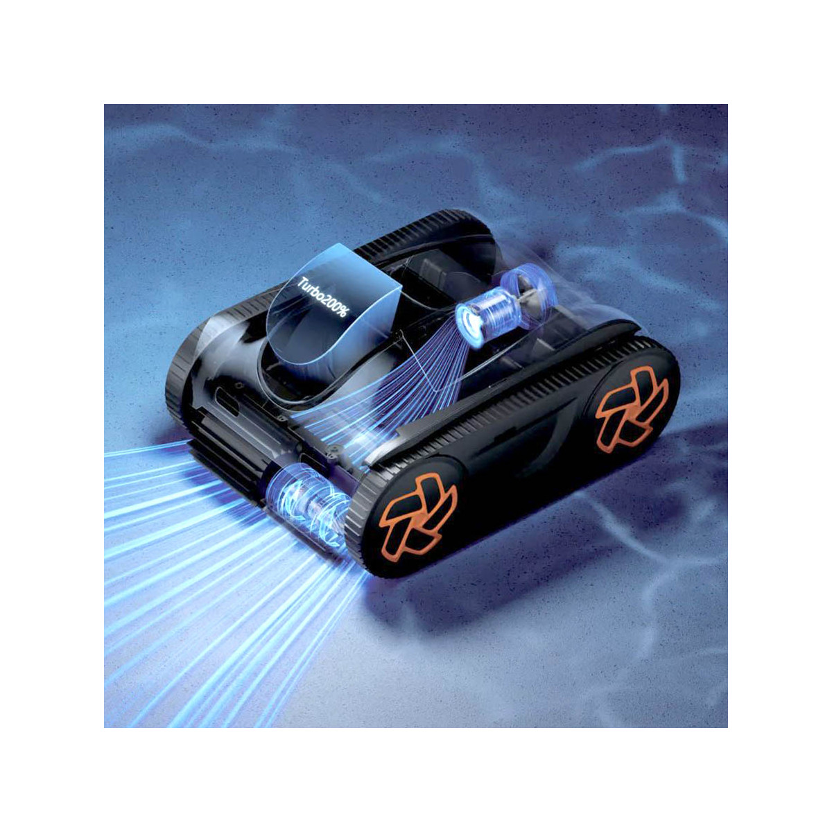 Vysávač si sám reguluje výkon podľa úrovne znečistenia bazéna. Novinkou je 200 % turbo výkon (možnosť aktivácie cez appku alebo priamo na vysávači), kedy si poradí aj s mimoriadne znečisteným bazénom. Pri tomto výkone vydrží batéria približne 2 h (čistenia dna, steny a línie vody).